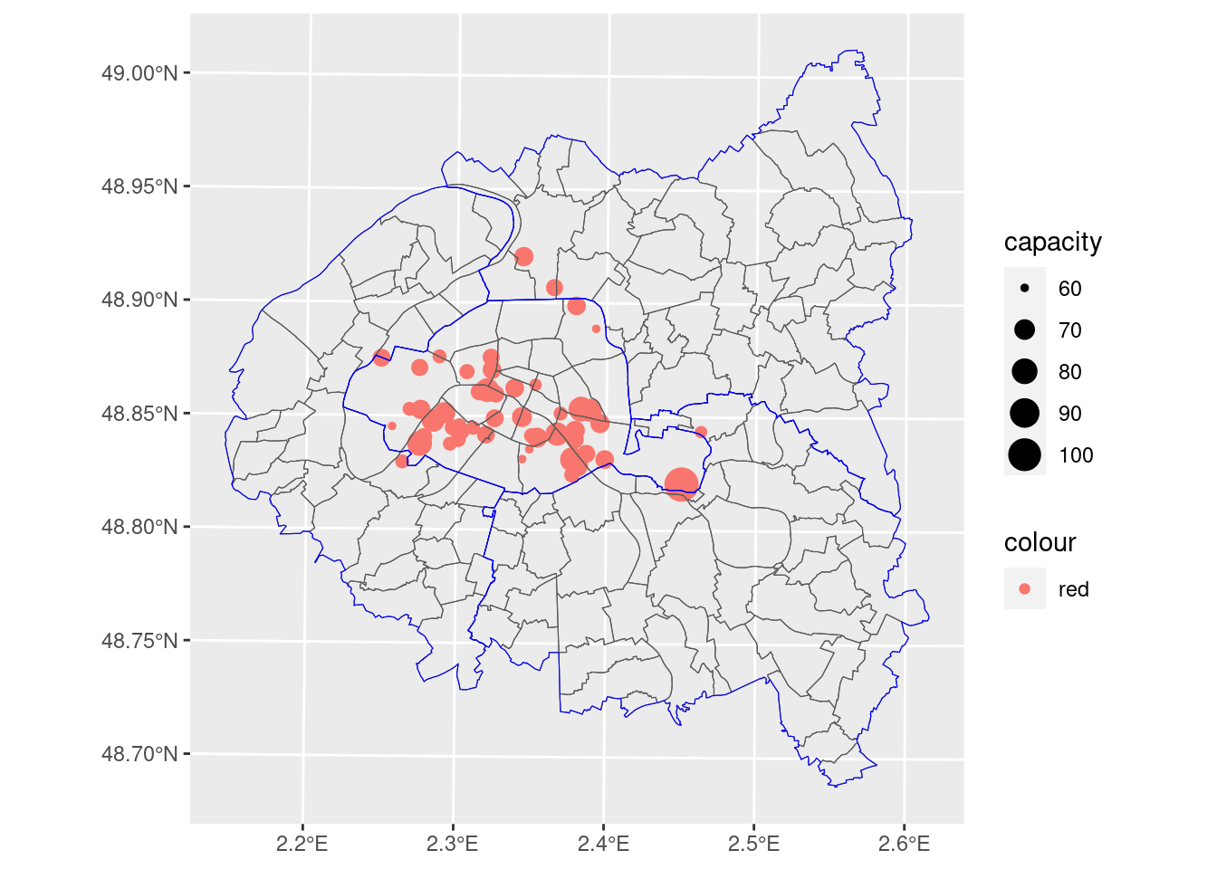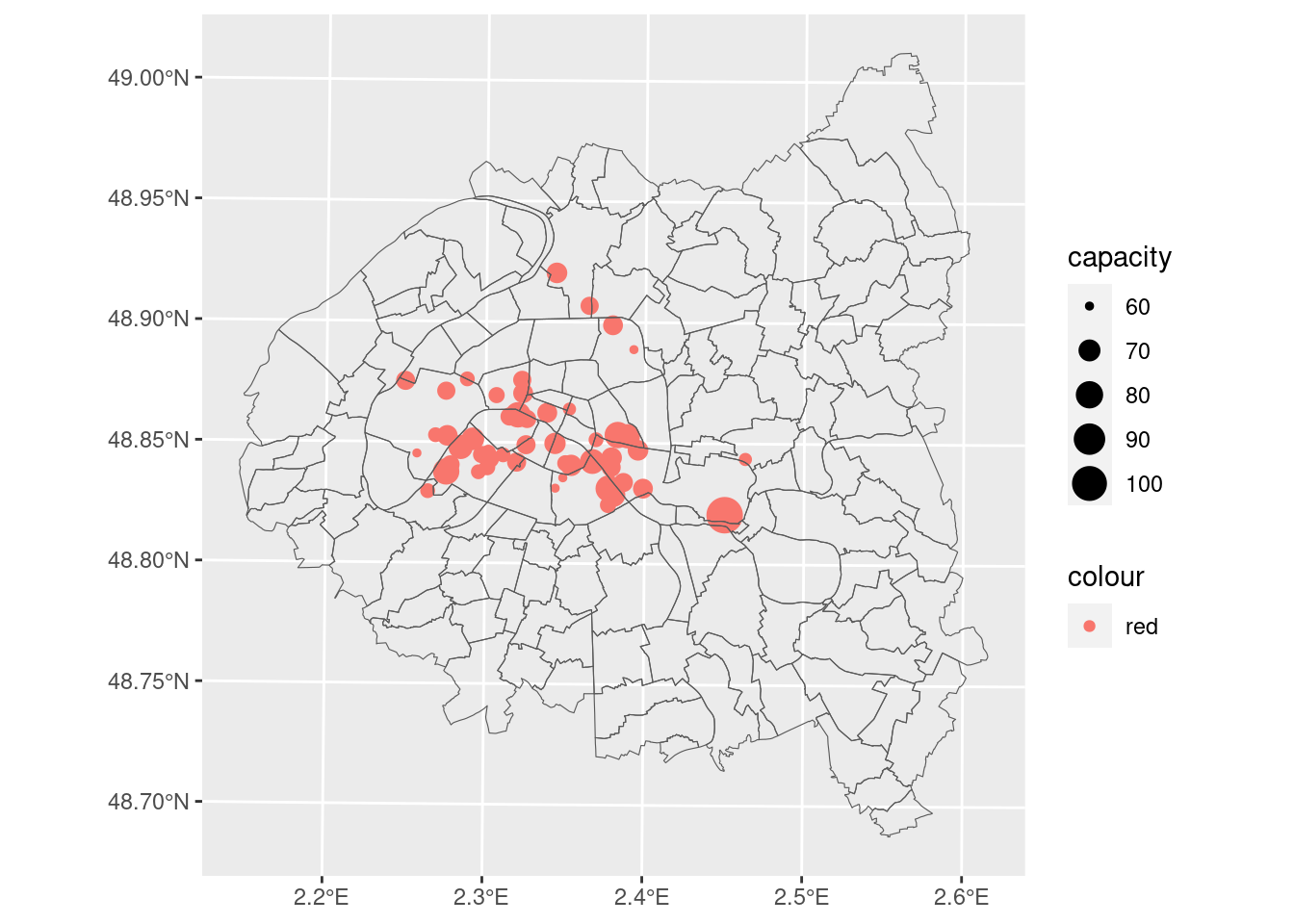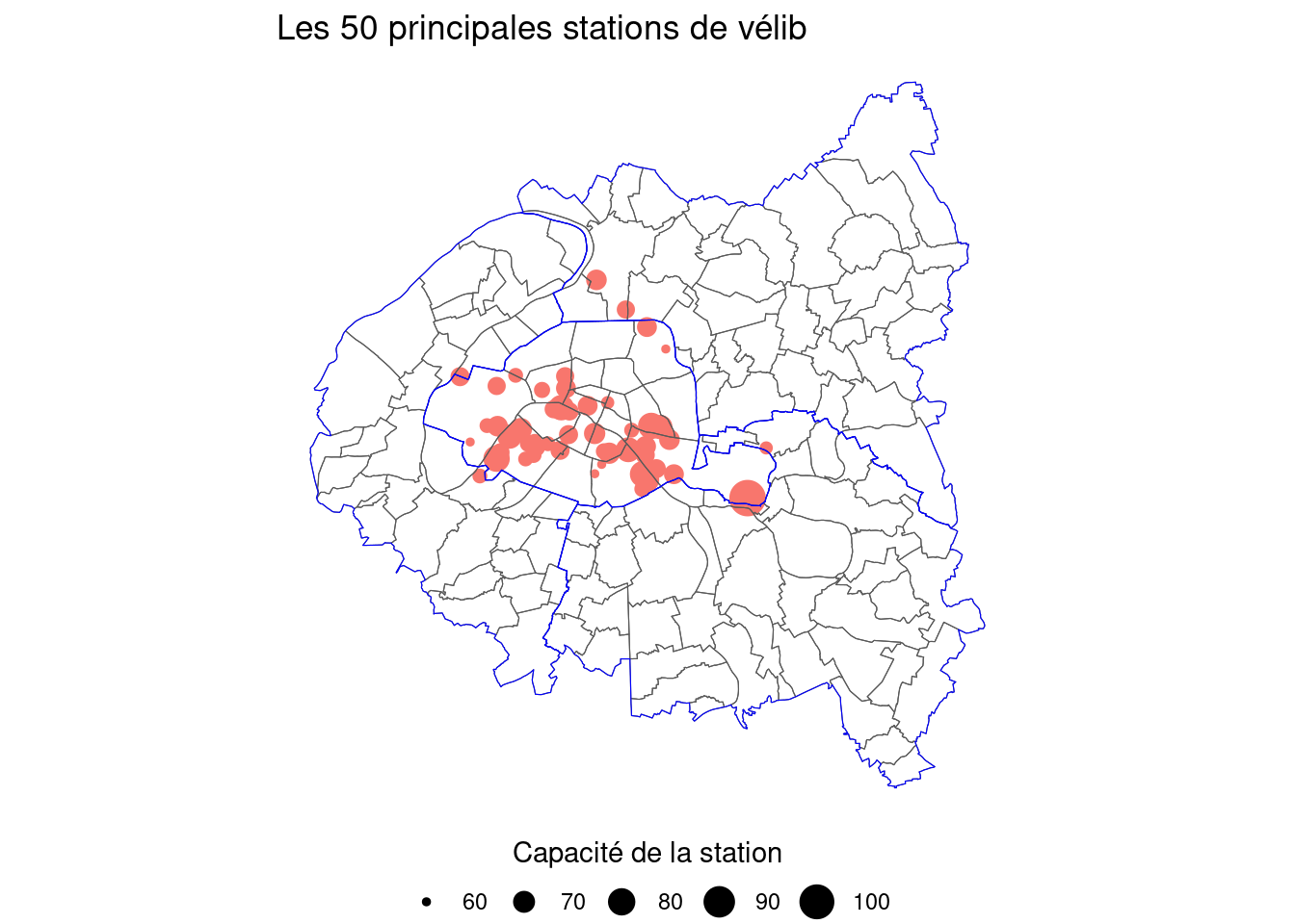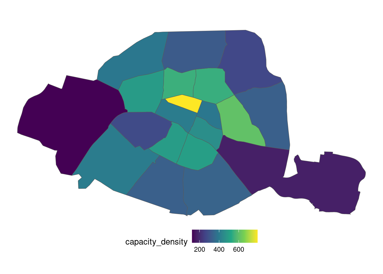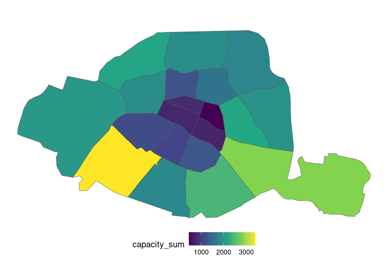 theme(legend.position = "none")- Compter le nombre de stations velib et le nombre de places velib par arrondissement ou commune. Représenter sur une carte chacune des informations