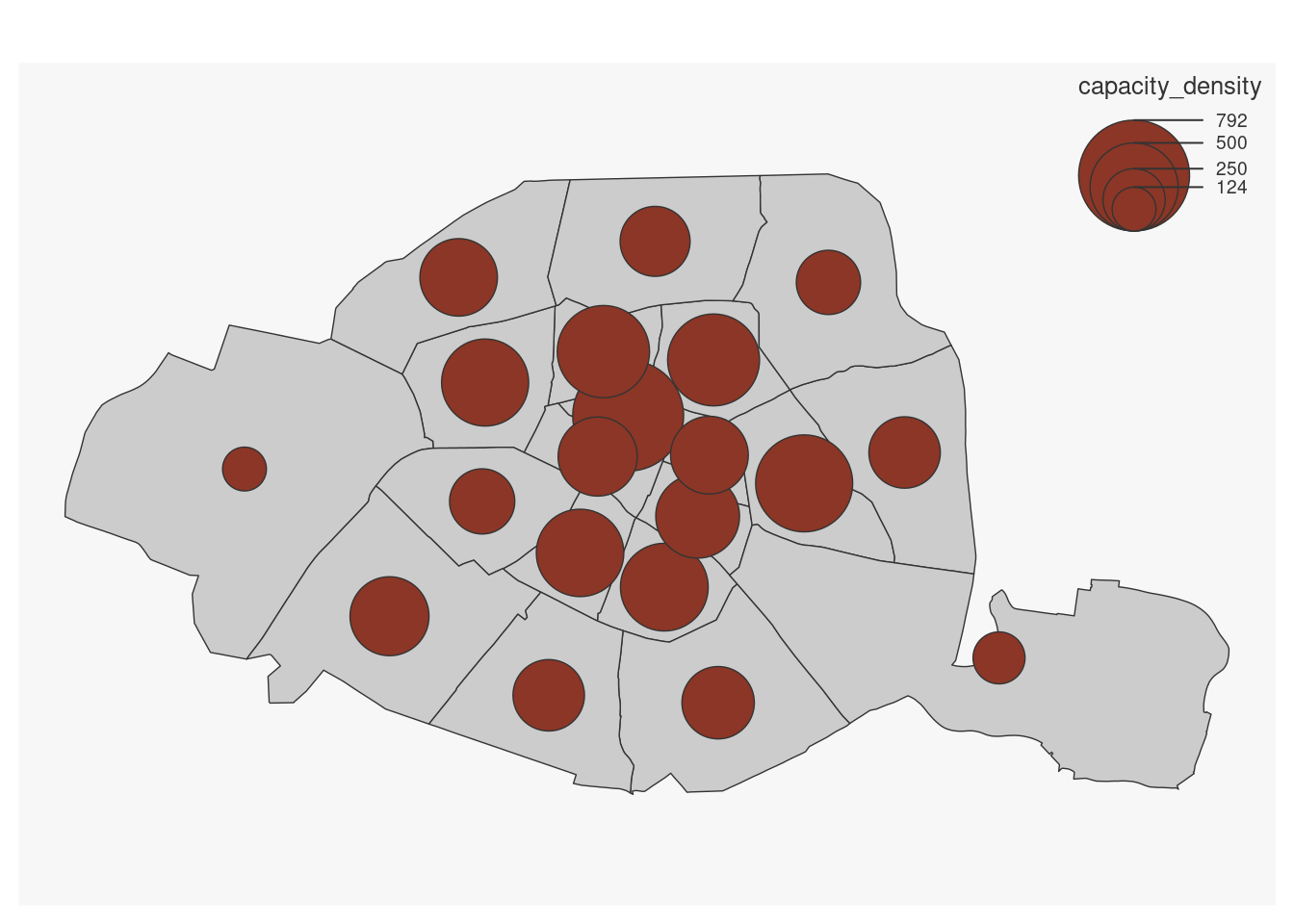 Si on représente plutôt la capacité sous forme de densité, pour tenir compte de la taille différente des arrondissements, les conclusions sont inversées et correspondent mieux aux attentes d’un modèle centr-périphérie. Les arrondissements centraux sont mieux pourvus, cela se voit encore mieux avec des ronds proportionnels plutôt qu’une carte chorolèpthe.