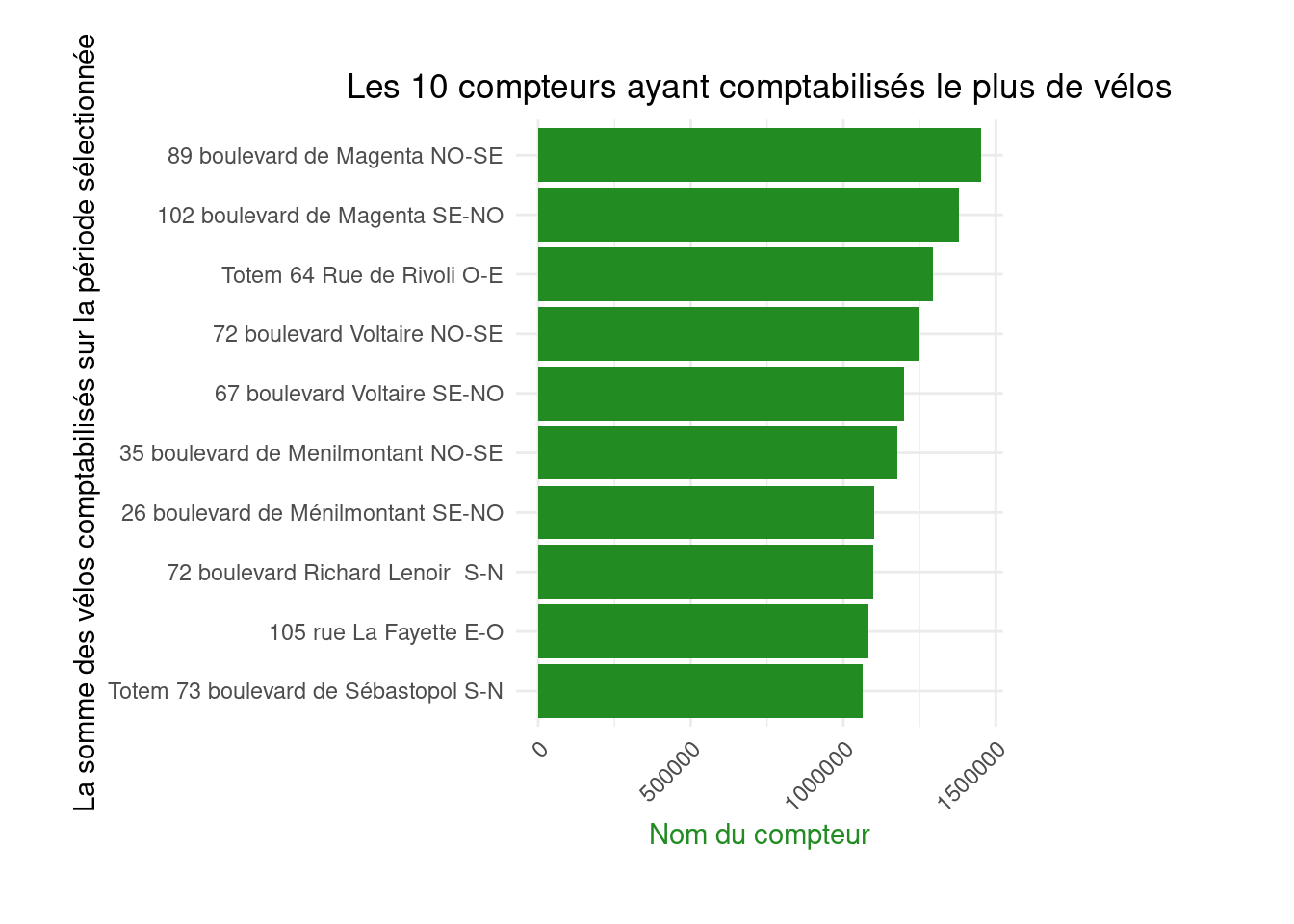 labs(title = "Les 10 compteurs ayant comptabilisés le plus de vélos",