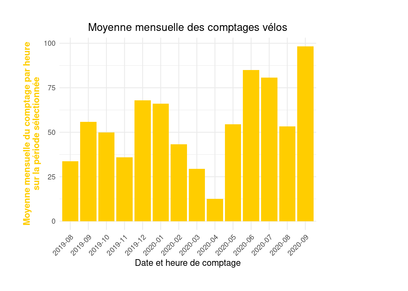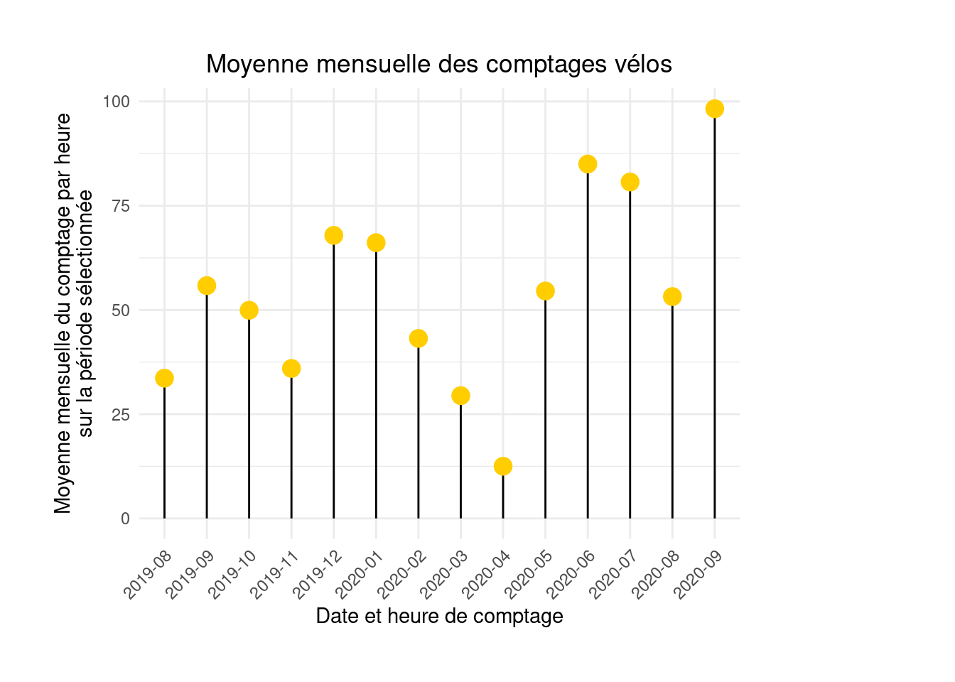 labs(x = "Date et heure de comptage", y = "Moyenne mensuelle du comptage par heure\nsur la période sélectionnée",
