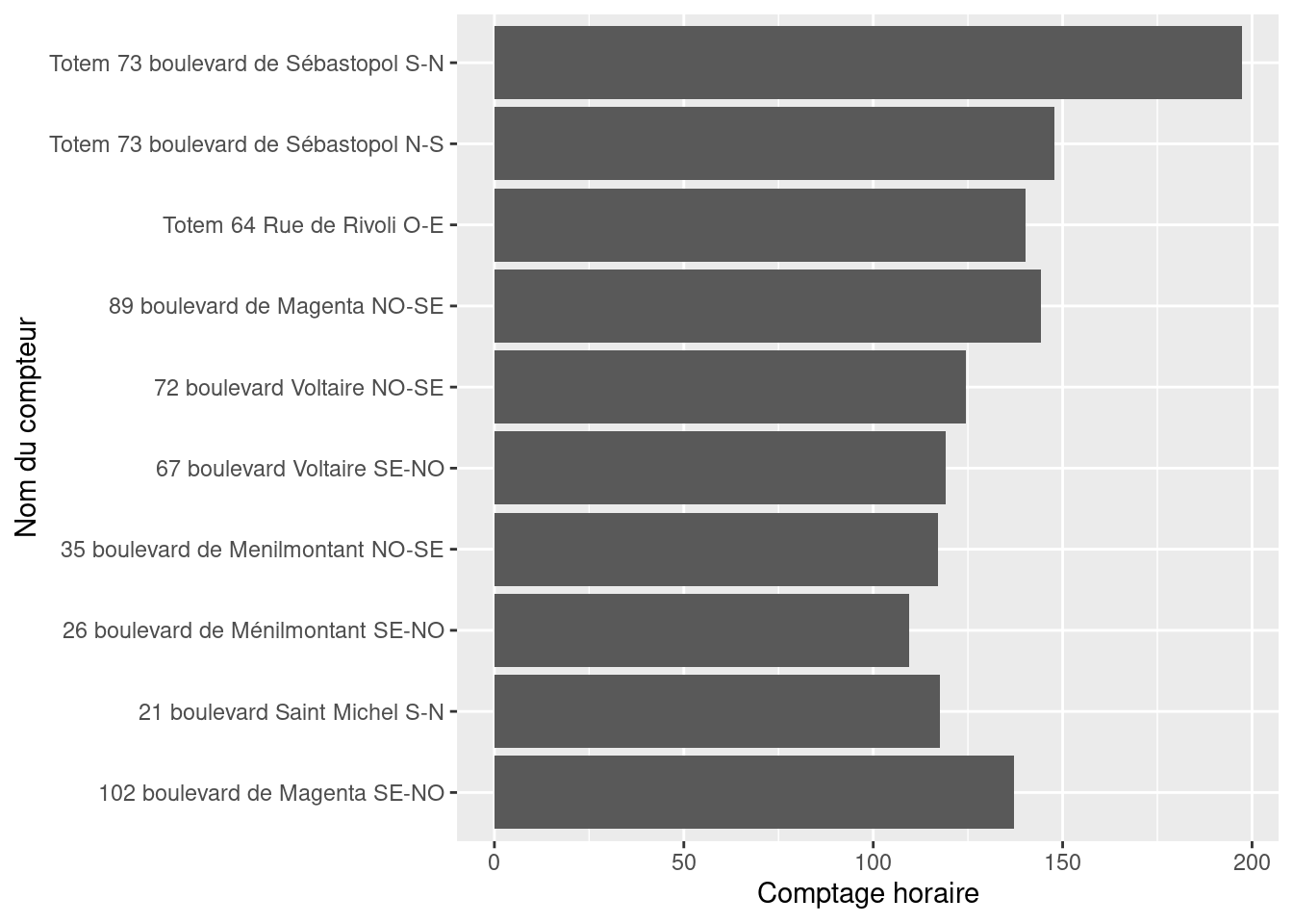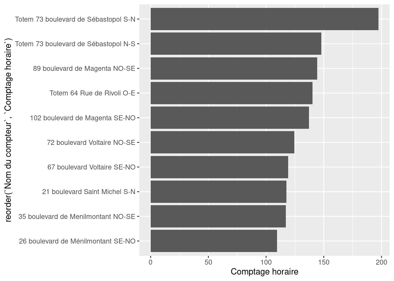 df1 <- df1 %>% mutate(`Nom du compteur` = fct_reorder(`Nom du compteur`, `Comptage horaire`))