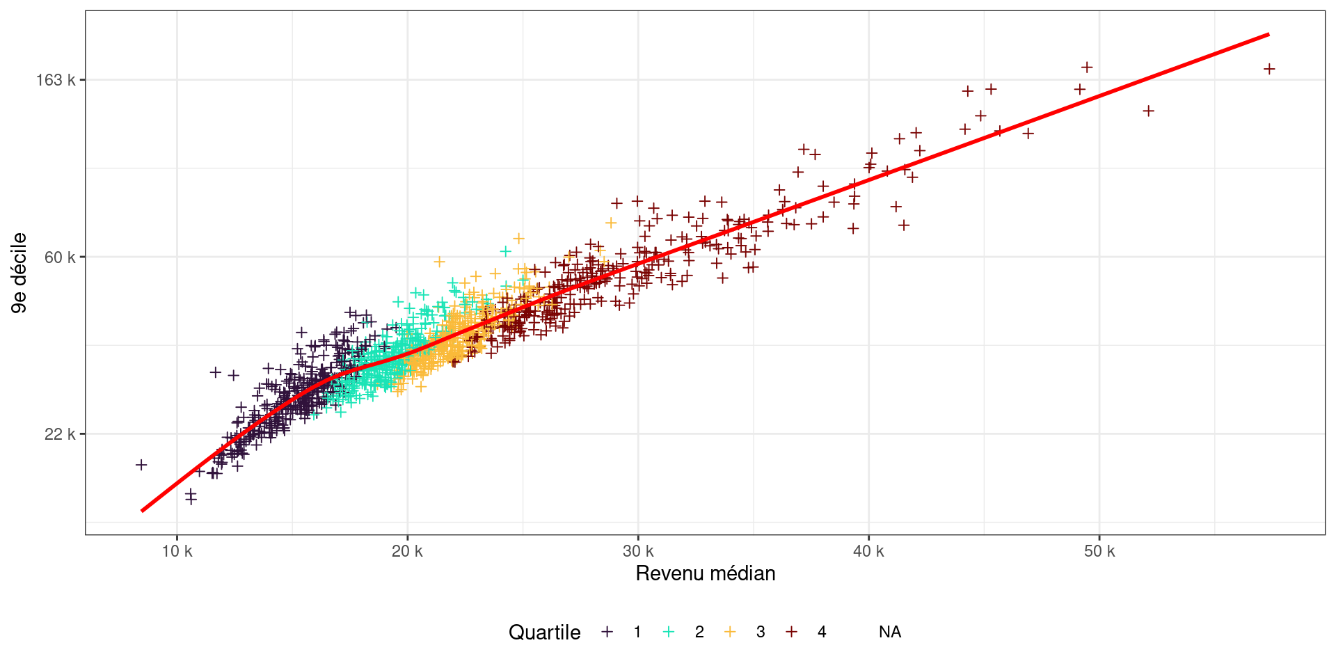 labs(x = "Revenu médian", y = "9e décile", color = "Quartile") +